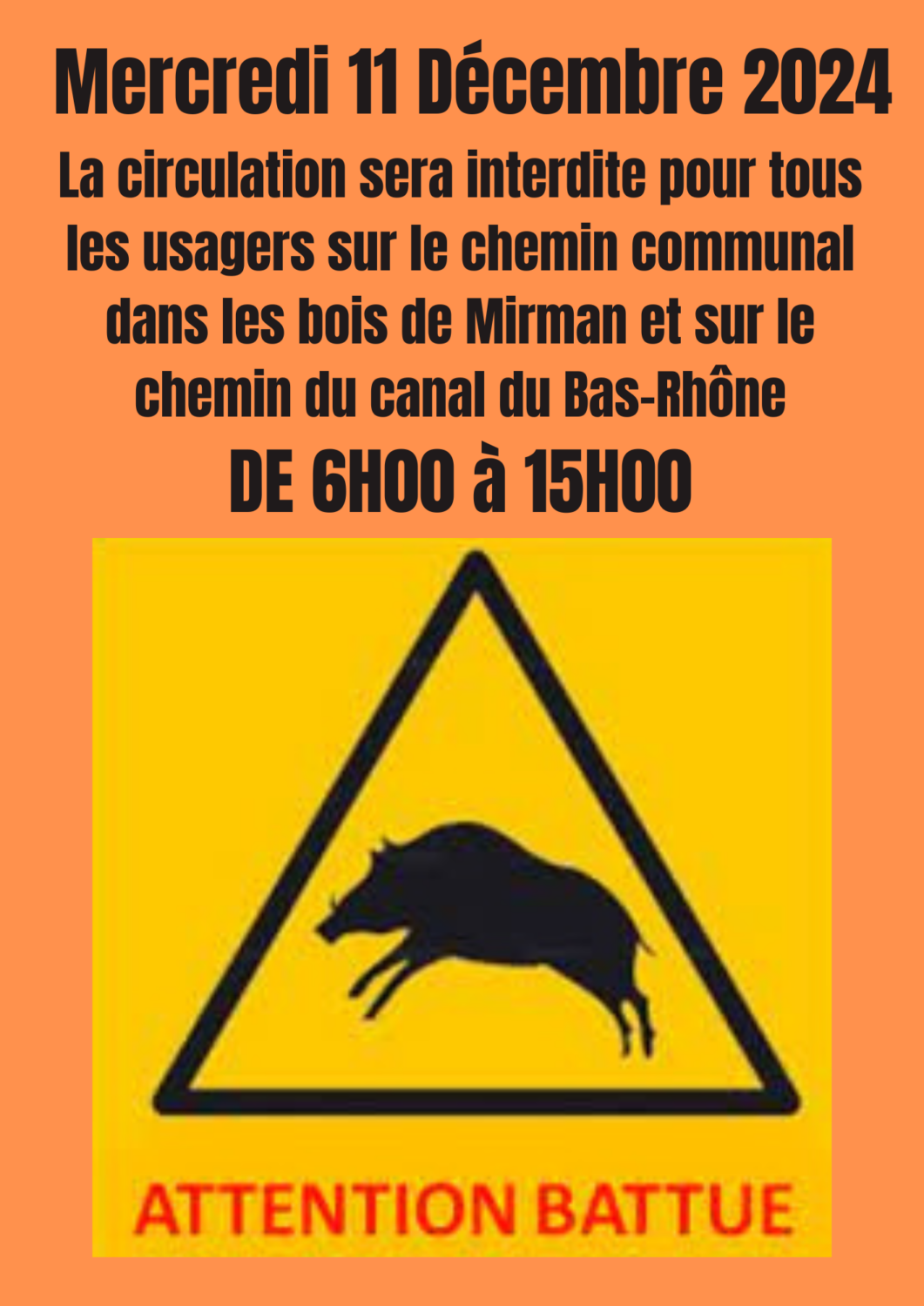 La circulation sera strictement interdite pour tous les usagers le mercredi 11 décembre 2024 entre 06h00 et 15h00, sur le chemin traversant le bois de Mirman à partir de la rue de Bellevue et le chemin du canal du bas-Rhône entre le mas Bolchet et l’ancienne route de Saint-Gilles.