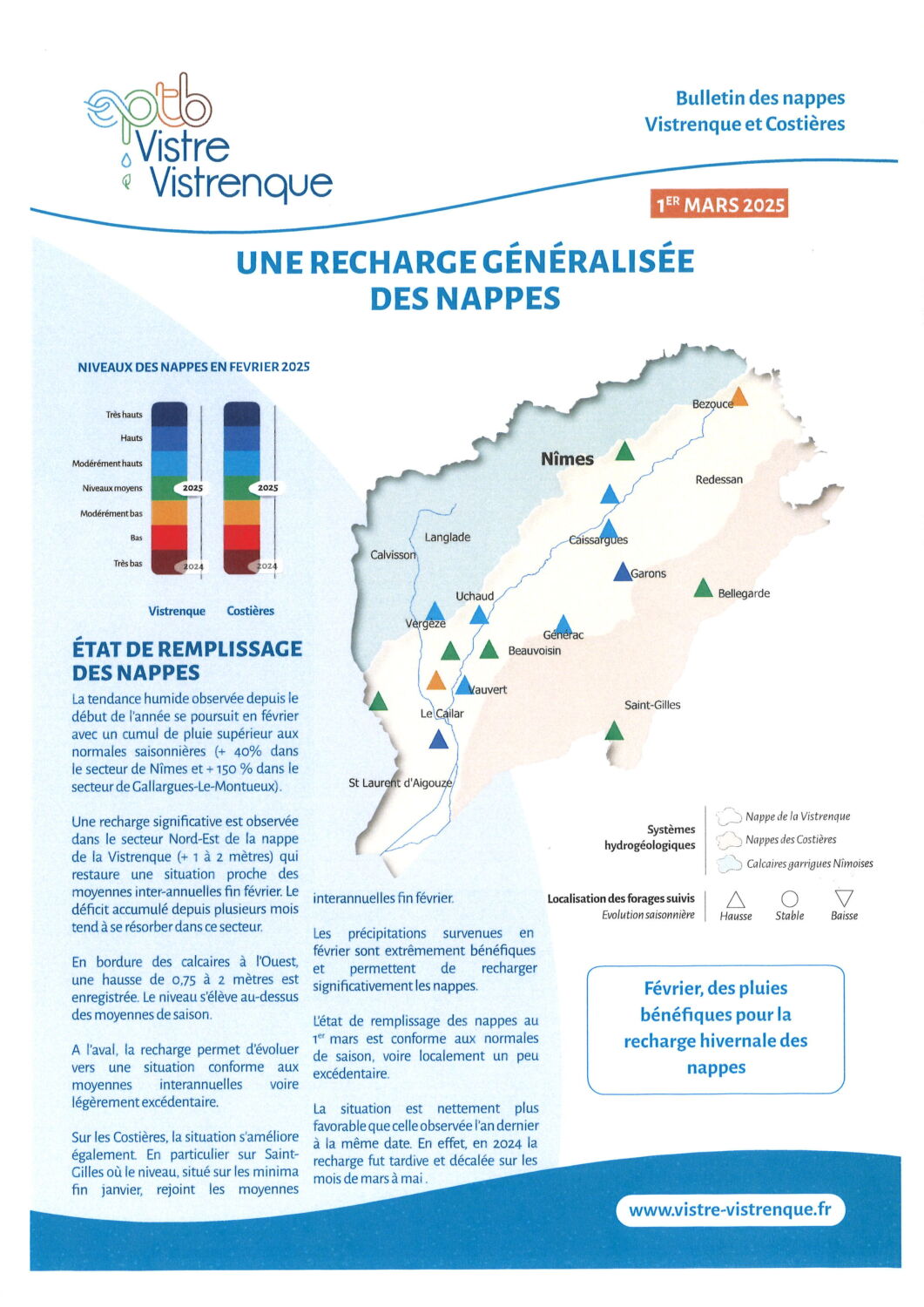 Voici le bulletin des nappes Vistrenque et Costières au 1er Mars 2025 communiqué par L’EPTB Vistre Vistrenque.