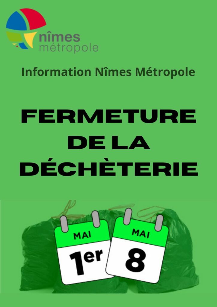 Nîmes Métropole informe : Pour ce jeudi 1er mai, et pour jeudi 8 mai, des fermetures sont à prévoir sur les déchèteries de notre territoire