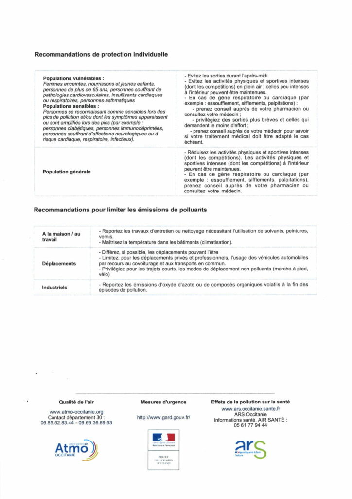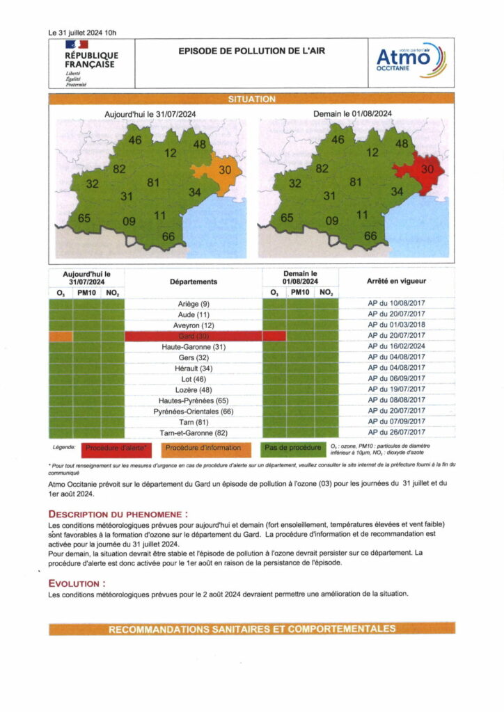 Les journées du mercredi 31 juillet et du jeudi 1er août sont marquées par un épisode de pollution de l’air qui touche l’ensemble du département du Gard, selon Atmo Occitanie. Une pollution à l’ozone touche actuellement le département du Gard, en raison des conditions météorologiques qui y sont favorables, c’est-à-dire des fortes chaleurs, un fort ensoleillement et un vent faible. Par conséquent, pour la journée du mercredi 31 juillet, la procédure d’information et de recommandation est