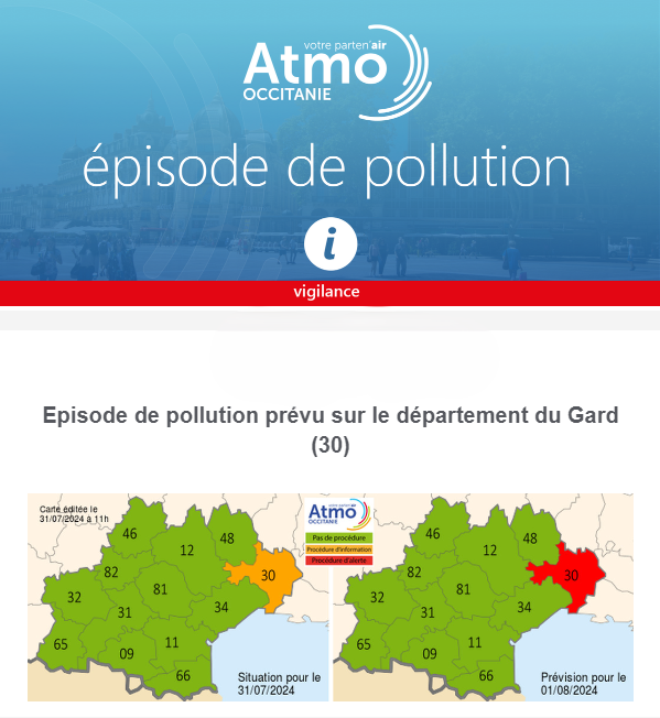 activée sur le département, correspondant à une alerte « orange ». Toutefois, la situation devrait persister ce jeudi 1er août, selon les prévisions d’Atmo Occitanie. C’est la raison pour laquelle cette journée sera placée en alerte rouge.