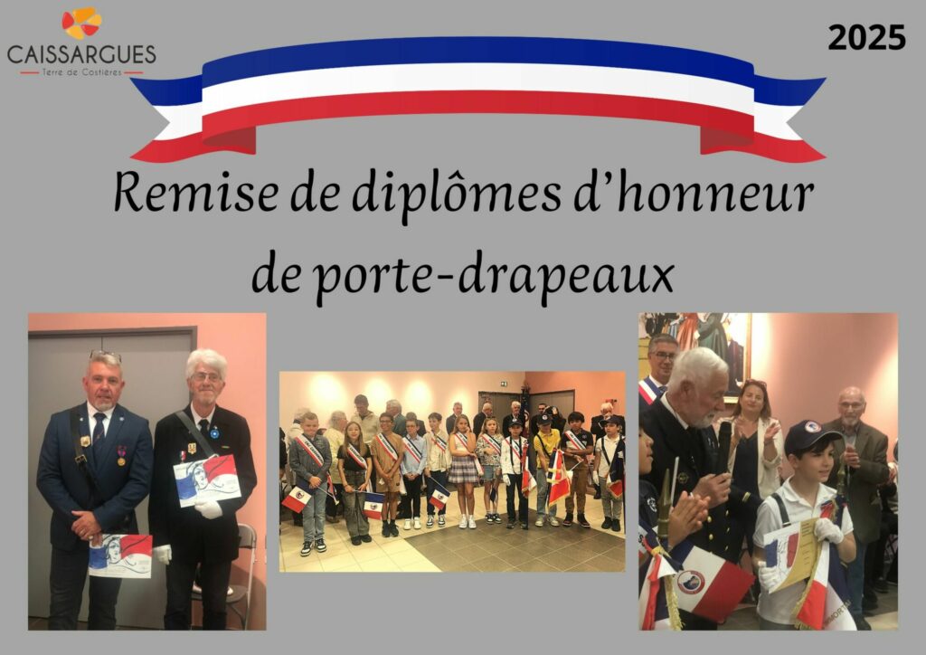 Puis il a été décerné deux médailles aux deux fidèles porte-drapeaux, Messieurs Richard Collins et Jacky Sauvant, ainsi qu’un diplôme d’honneur de porte-drapeaux à Mme Naïg Godin et aux jeunes porte-drapeaux présents.