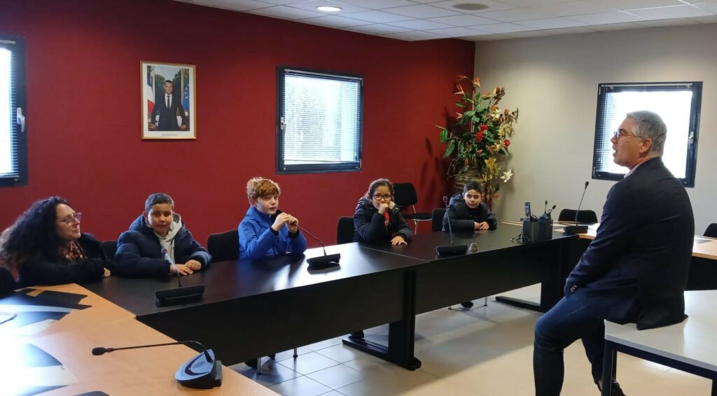Ce jeudi 23 janvier, en début d’après-midi, quelques élèves de la classe du château sont venus en visite à la mairie, accompagnés de leur professeur des écoles et de son AESH (accompagnante des élèves en situation de handicap).