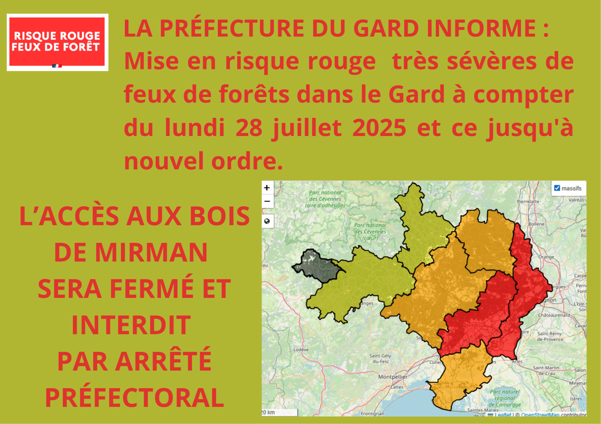 La Préfecture du Gard met en Risque rouge très sévère de feux de forêts le département du Gard à compter du lundi 28 juillet, et ce jusqu’à nouvel ordre.