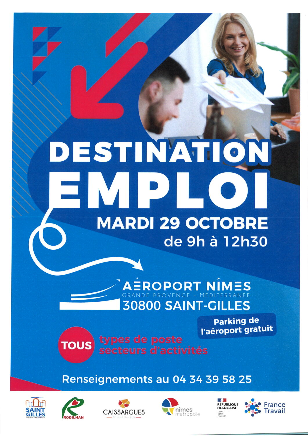 Le forum Destination Emploi, organisé conjointement par les communes de Caissargues, Saint Gilles et Rodhilan, et les entreprises locales, aura lieu le mardi 29 octobre de 9h à 12h30 sur le site de l aéroport de Nîmes Garons (parking gratuit pour l occasion). Tous types de poste, tous types de secteurs d’activités.