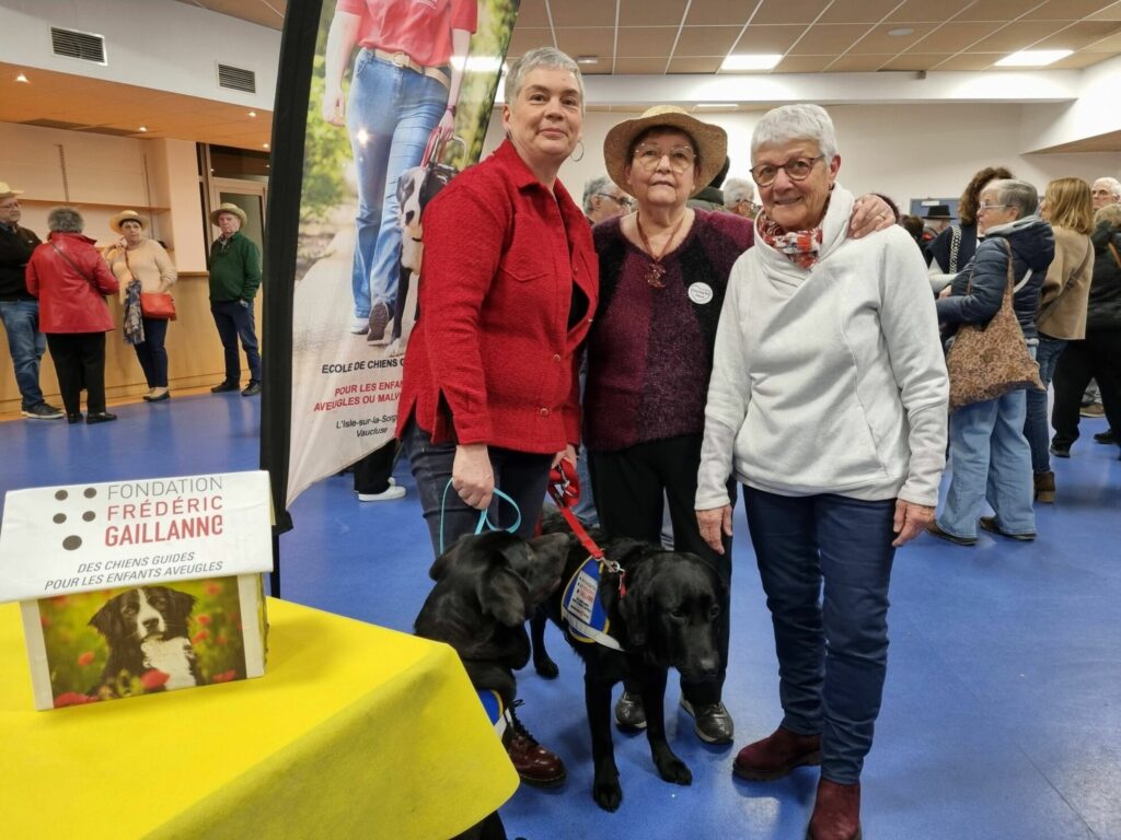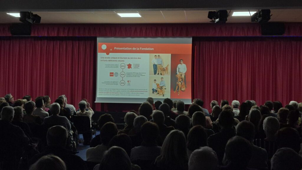 Après quelques mots de la présidente, une vidéo présentant la Fondation, école de chiens guides pour enfants aveugles. fut projetée à l’écran avant la pièce de théâtre : deux de leurs bénévoles étaient présentes avec leurs chiots Appy et Roots.