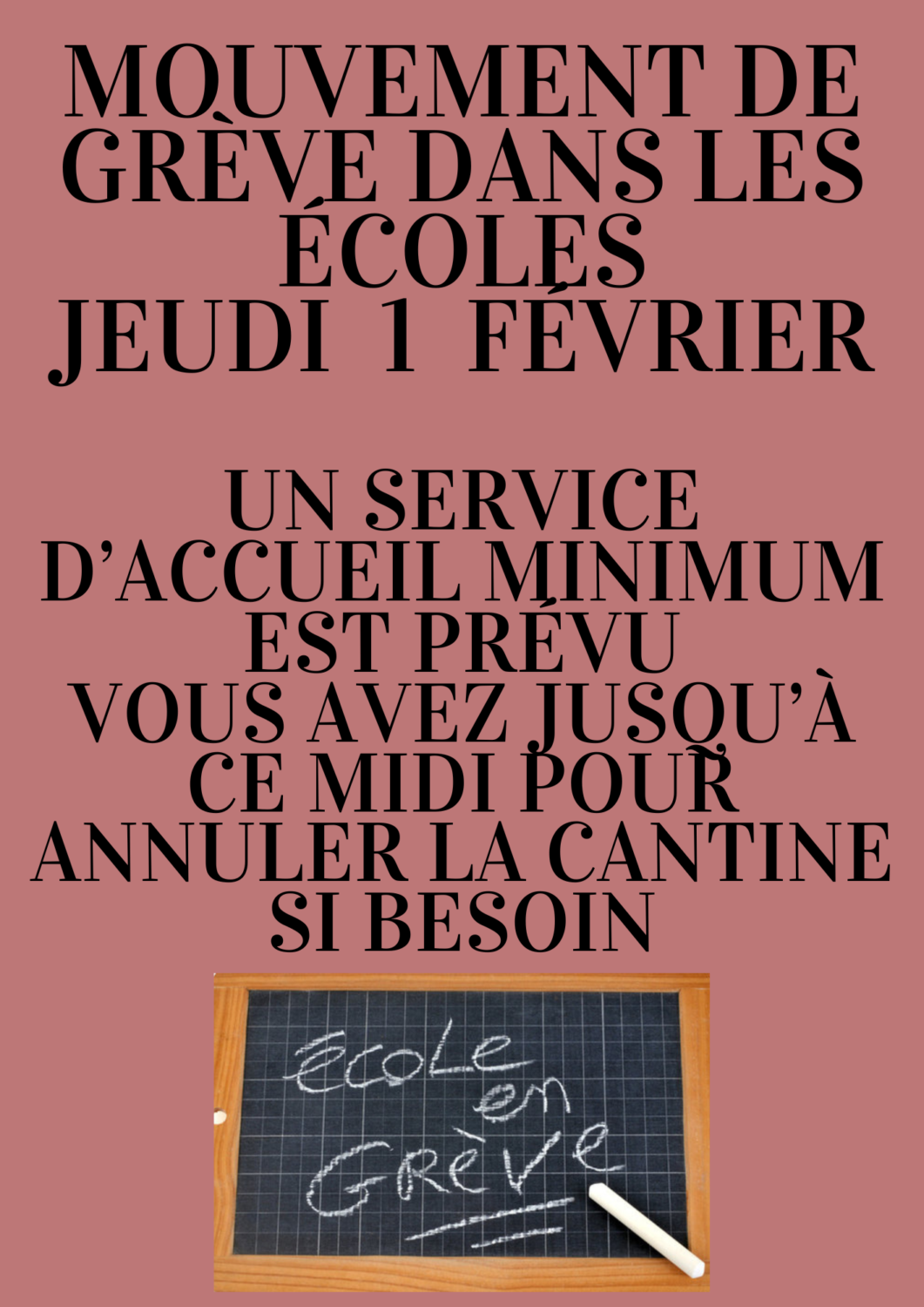 « Suite au mouvement de grève annoncé pour ce jeudi 1er février, aucun enseignant n’assurera les cours dans le groupe scolaire du Mirman et une classe sera fermée en maternelle Cambourin.