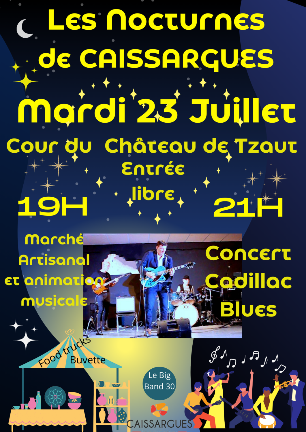 Le 4ème volet des Nocturnes de Caissargues vous attend déjà, mardi 23, dans la cour du château de Tzaut, avec le petit marché artisanal, les foodtrucks et comité des jumelages à la buvette !Le concert de 21H sera donné par les Cadillac Blues.