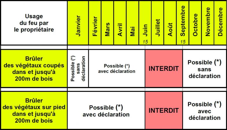 Pour les personnes propriétaires et ayants droit non-concernées par l’interdiction permanente de brûlage des déchets verts, ci-après, le rappel des périodes réglementées  pour l’emploi du feu.