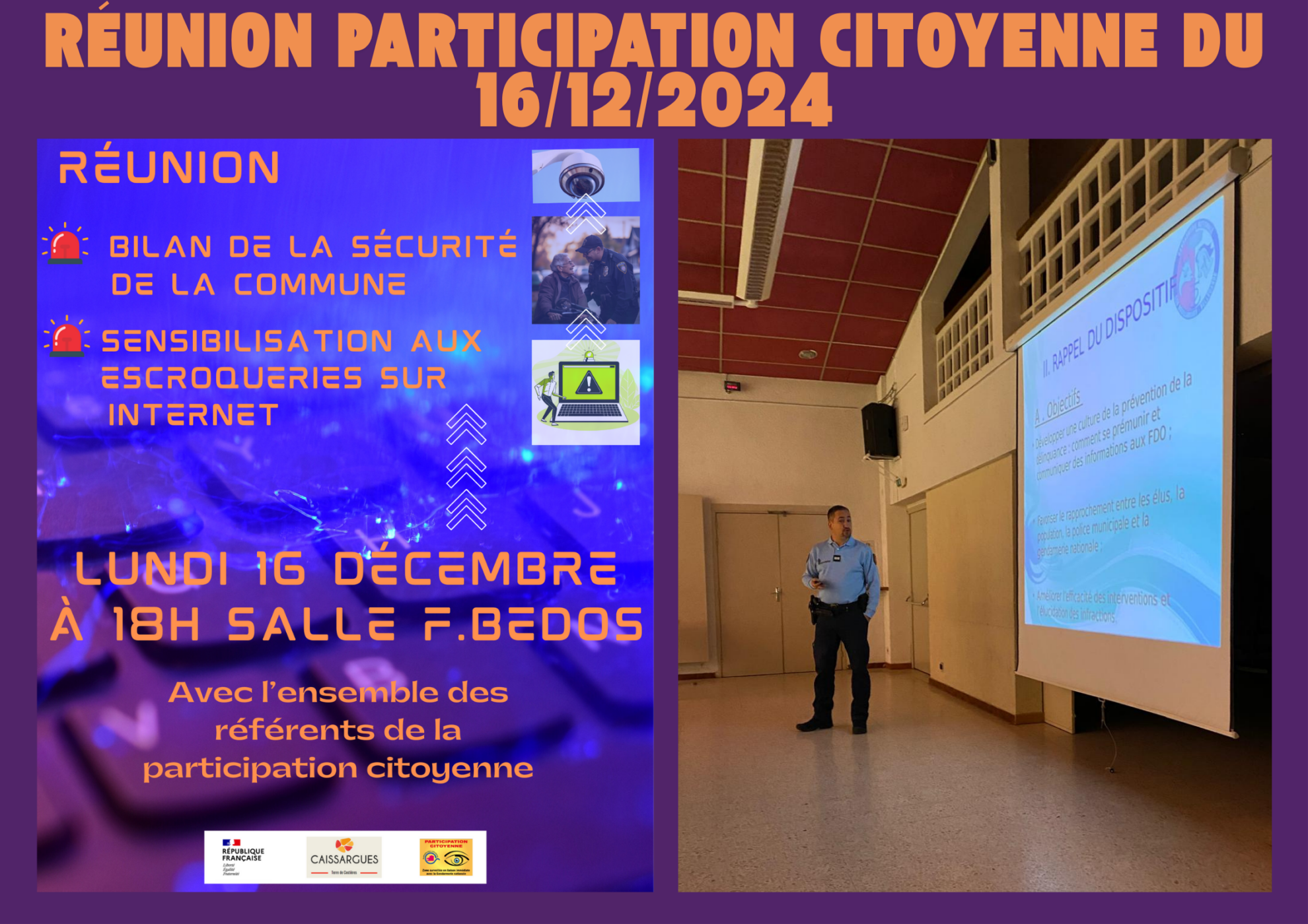Cette réunion s’est déroulée en présence du Lieutenant TERRONES, commandant la communauté de brigades de Gendarmerie de BOUILLARGUES / BELLEGARDE, de son adjoint le major MANCIP, de Mme LALOUETTE représentant la Police Municipale de CAISSARGUES, des adjoints Éric FABRE, Sandrine FAMERY. Pascal VALLADIER, des conseillers Jean FABRE et Yves-Richard COLLINS, et de plusieurs référents de la participation citoyenne de la commune.