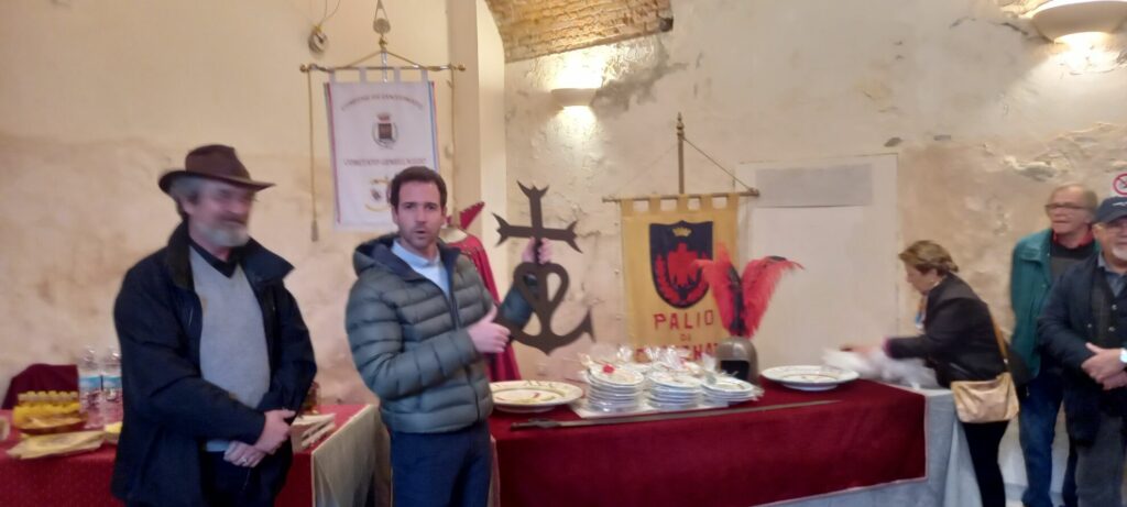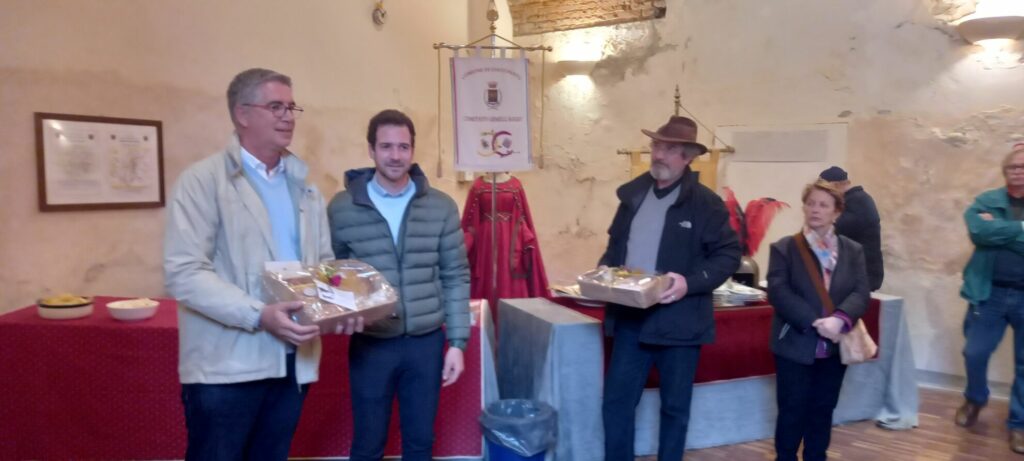 Remise des cadeaux, discours de bienvenue, rafraîchissements dans la salle où sont exposés les costumes de leur fête médiévale de septembre, suivi d’une soirée dans les familles d’accueil avec un dîner de gala.