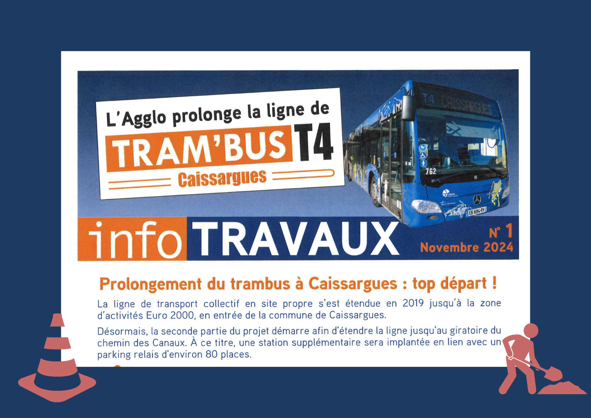 Le projet de prolongement de la ligne de trambus T4 à Caissargues est à nouveau sur les rails. Jusqu’à fin 2025, le chantier se déroulera progressivement du rond-point Fanfonne Guillierme (zone Euro 2000) à celui du Chemin des Canaux. Afin d’accompagner au mieux les usagers, Nîmes Métropole met en place des outils de communication de proximité.