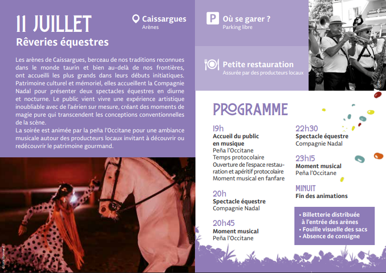 Ce sont nos arènes, berceau de nos traditions dans le monde taurin, et bien au-delà de nos frontières, qui seront mises en lumière en accueillant la compagnie Nadal qui présenteront 2 fois leur spectacle équestre, un en diurne et un en nocturne.