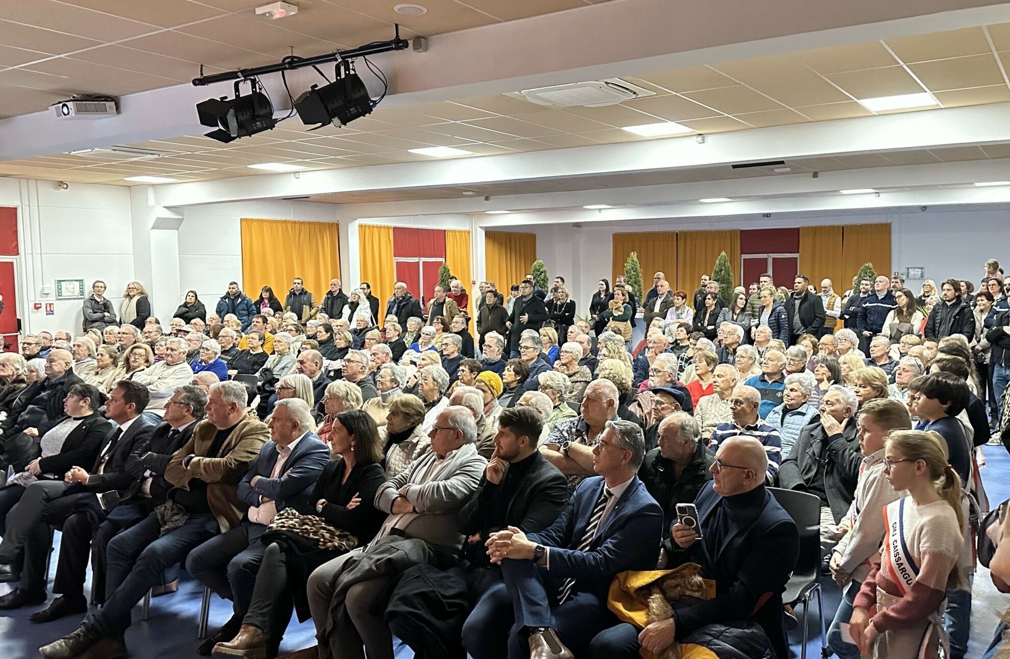 Et une belle réussite ! Les Caissarguais se sont déplacés en nombre, un peu plus de 300 personnes étaient présentes. Ils ont été accueillis comme il se doit, avec un tapis rouge et une haie d’honneur composée des adjoints et conseillers municipaux, de Monsieur le Maire ainsi que du conseil municipal des jeunes. Une soirée lancée par M. Eric Fabre, 1er adjoint, qui a invité le CMJ à monter sur scène pour une lecture de bienvenue et de bonne année. Ensuite, place à la diffusion d’un diaporama animé permettant de dresser un bilan des différentes actions menées depuis quelques années sur la commune, mais surtout, dans le but de rappeler à quel point Caissargues est riche en termes d’animations associatives !