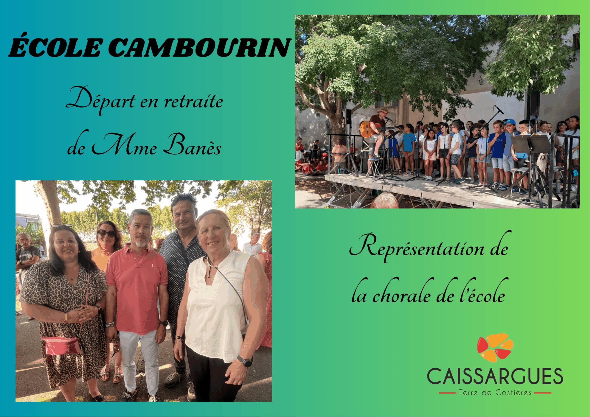 Une émouvante cérémonie pour le départ à la retraite de Madame Banes, enseignante et directrice de l’école primaire Cambourin : Jeudi 26 juin en fin d’après-midi, Madame Banes a réuni autour d’elle ses proches, ses collègues, d’anciens élèves ainsi que des représentants de la municipalité, à l’occasion de son départ à la retraite.